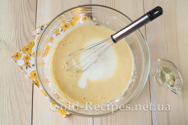 Останнім додамо очищену рослинну олію. Вона допоможе зробити тонкі млинці на кефірі еластичними.