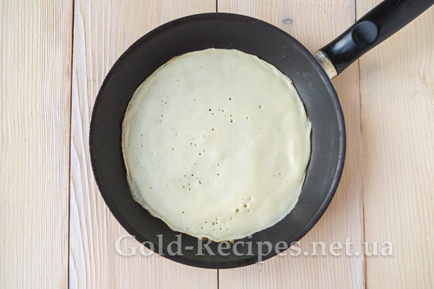 Акуратно виливаємо на гарячу сковороду трохи тіста. Обертаючи сковорідку, рівномірно розподілимо тісто по поверхні.