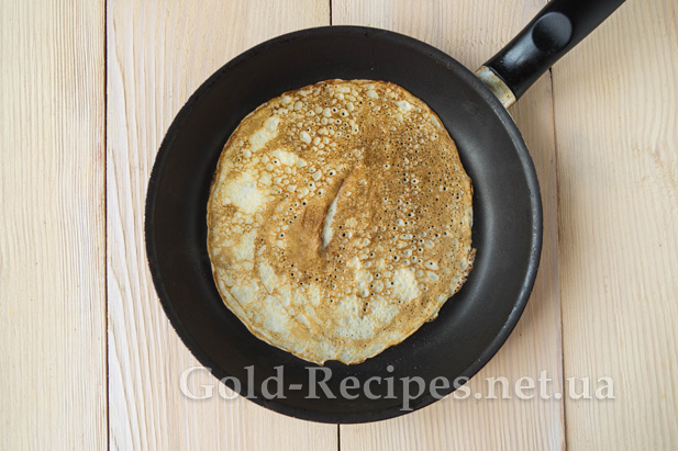 Обсмажимо млинець до золотистого кольору. Потім обережно перевернемо його, допомагаючи собі лопаткою. Обсмажимо його на середньому вогні до готовності.