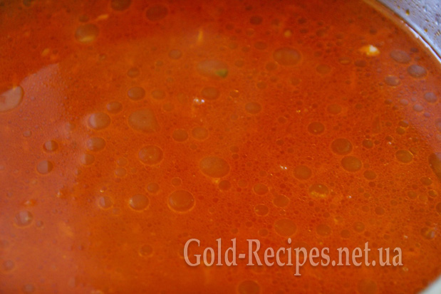 У бульйон, доведений до кипіння, додаємо овочі з томатною пастою, перемішуємо і варимо 5 хвилин.