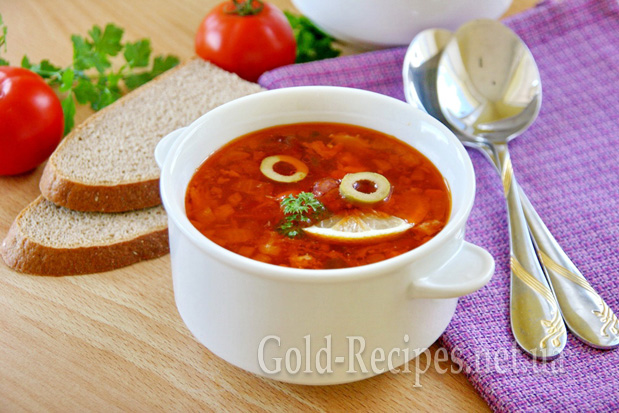 Після цього розливаємо по тарілках, прикрашаємо кружечком лимона, зеленню, маслинами або оливками. За бажанням можна додати сметану.