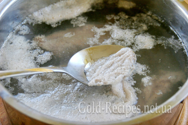 Кладемо реберця у воду, ставимо на вогонь. Коли вода закипить, зменшуємо вогонь і акуратно знімаємо піну, що з’явилася.
