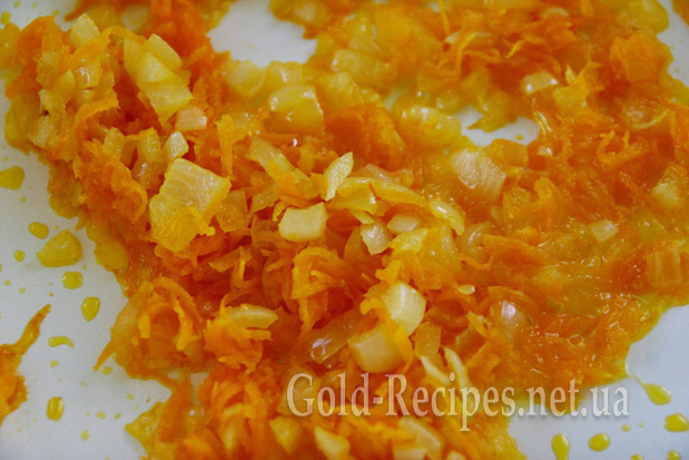 Моркву тремо на дрібній тертці, додаємо на пательню до цибулі, перемішуємо і пасеруємо все разом на маленькому вогні близько 5 хвилин.