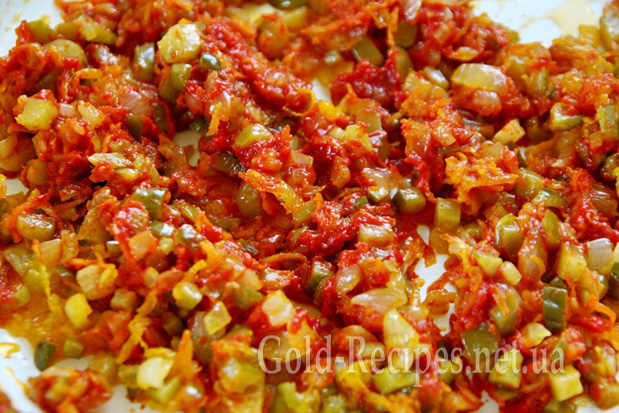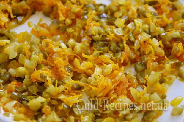 Огірки ріжемо дрібними кубиками. Додаємо до цибулі та моркви й тушкуємо все разом ще 5 хвилин.