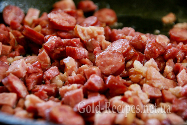 Обсмажуємо копченості на сильному вогні 3-4 хвилини, періодично помішуючи.