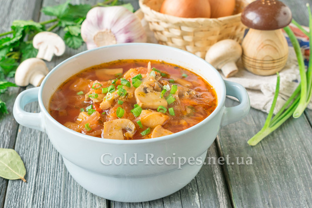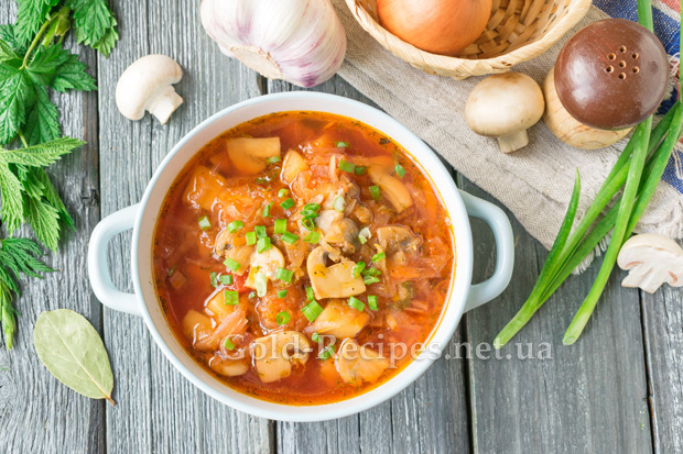 Завдяки грибам печерицям пісний борщ виходить поживним і дуже ароматним.