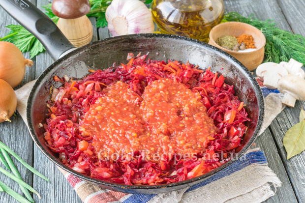 Коли картопля та капуста стануть м’якими, додамо в борщ обсмажені овочі з томатним соком. Перемішаємо і продовжимо томити пісний борщ без м’яса з грибами на повільному вогні.