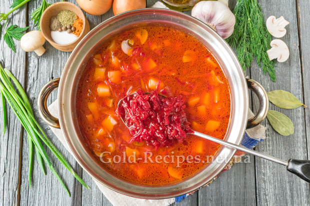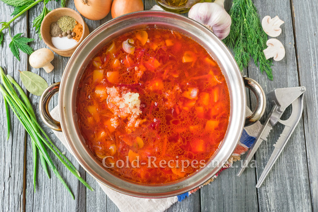 Наприкінці приготування додамо в борщ пропущені через прес зубчики часнику.