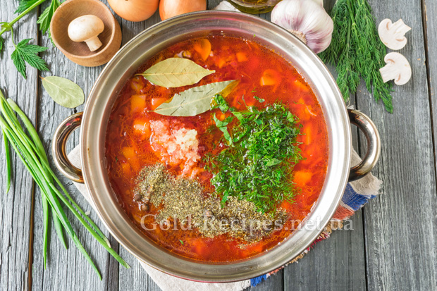 Посолимо борщ за смаком, приправимо його спеціями та свіжою зеленню.