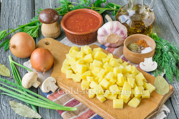 Бульби картоплі очистимо від шкірки, поріжемо кубиком. Перекладемо порізані овочі в каструлю.