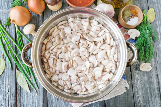 Свіжі печериці помиємо та почистимо. Поріжемо гриби великими слайсами і додамо до картоплі.