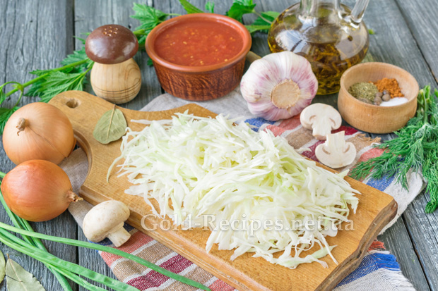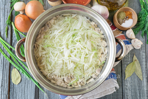Білокачанну капусту нашаткуємо тонкою соломкою. Додамо її в каструлю з борщем і продовжимо варити інгредієнти разом на повільному вогні до м’якості овочів.