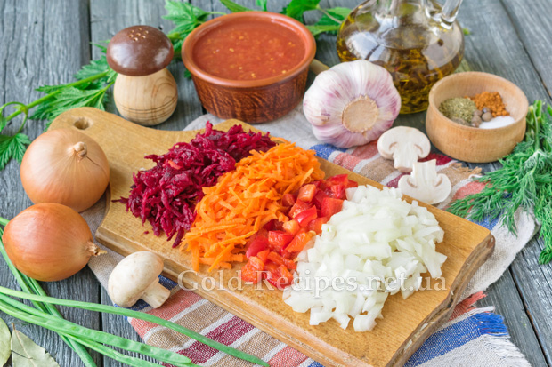 Ріпчасту цибулю та болгарський перець поріжемо цибулею. Буряк і моркву очистимо від шкірки та натремо на тертці з великим полотном.