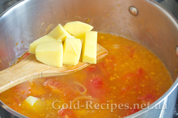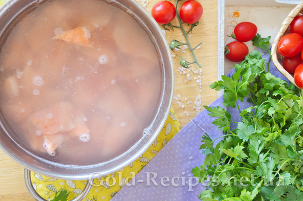 Потім наливаємо в каструлю рибний бульйон і додаємо картоплю. Накриваємо кришкою, доводимо до кипіння і варимо до готовності картоплі.