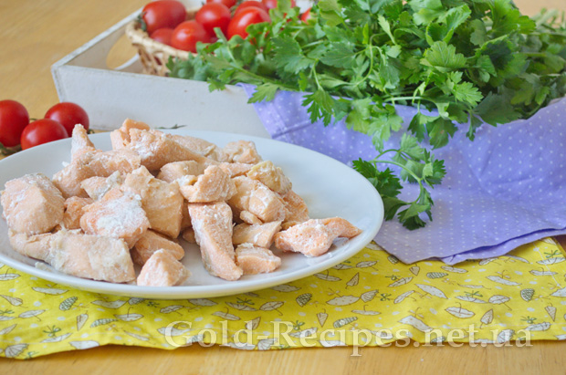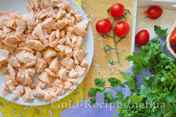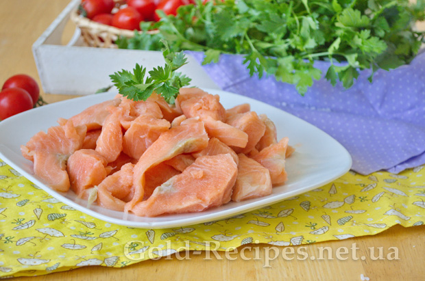 З відвареного філе лосося видаляємо всі кісточки, і розділяємо рибу на дрібні шматочки.