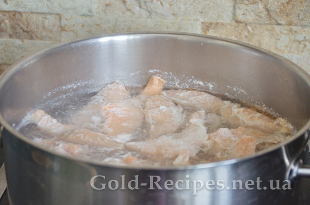 Заливаємо філе лосося холодною водою і ставимо на плиту.