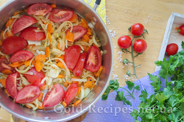 Додаємо до цибулі та моркви порізані помідори, і продовжуємо тушкувати ще 2-3 хвилини, поки помідори не пустять сік.