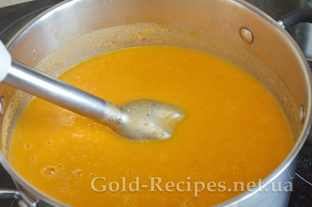 Коли картопля в нашому супі звариться, перетворюємо вміст каструлі на однорідне пюре за допомогою занурювального блендера.