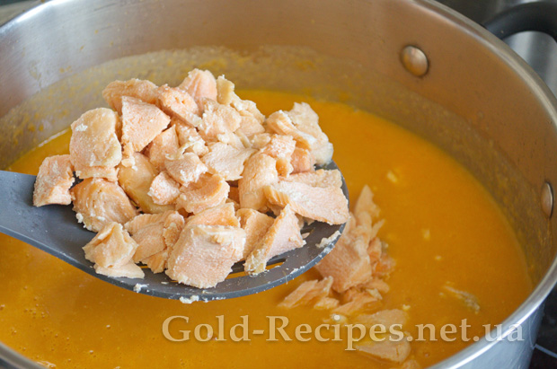 Потім додаємо шматочки лосося, доводимо суп до кипіння і проварюємо 2-3 хвилини.