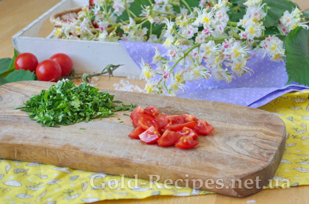 Заздалегідь наріжемо свіжі помідори та зелень петрушки для подачі нашого супу з лососем.