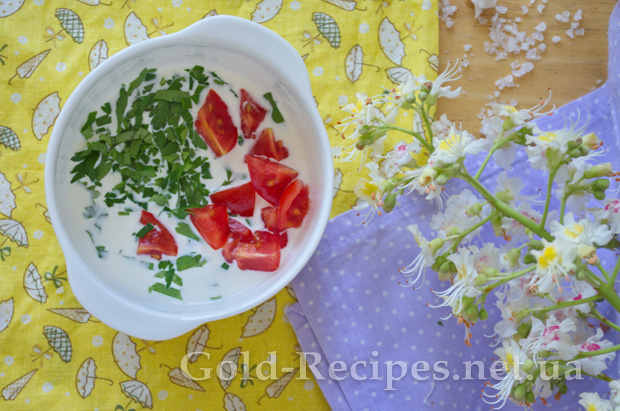 У глибоку тарілку наливаємо трохи вершків, додаємо свіжі помідори та петрушку.