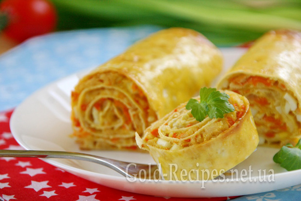 Тому, зібравшись готувати, я трохи зімпровізувала. І в мене вийшов рулет з куркою, яйцем і овочами.