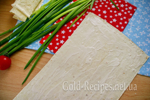 Змащуємо лист лаваша 1 ст.л. майонезу (бажано – домашнього).