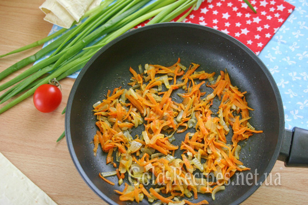 Підготуємо начинку для рулету. Цибулю нарізаємо півкільцями, моркву тремо на крупну тертку.