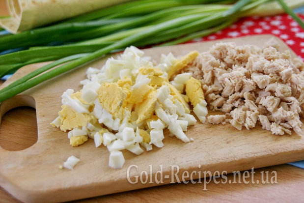 Куряче філе відварюємо до готовності, нарізаємо невеликими кубиками. Яйце варимо круто, охолоджуємо, чистимо і теж нарізаємо кубиками.