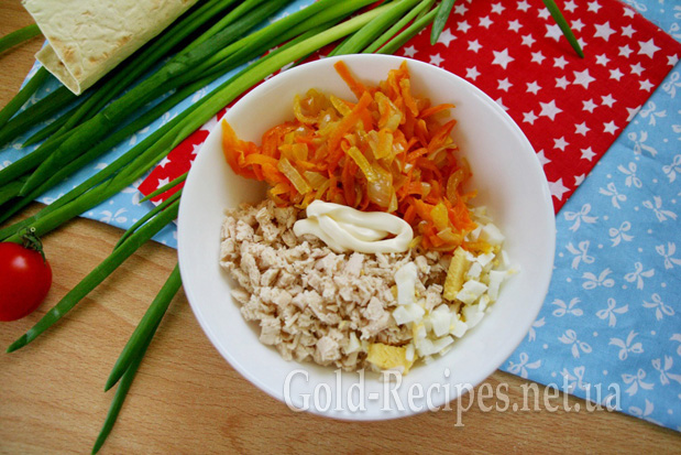 З’єднуємо інгредієнти для начинки: цибулю з морквою, куряче філе, яйце. Додаємо майонез, що залишився, і перемішуємо. За необхідності солимо та перчимо за смаком.