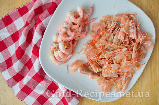Креветки заливаємо окропом, і відставляємо в сторону до повного охолодження. Потім чистимо морепродукти від панцира і голови.