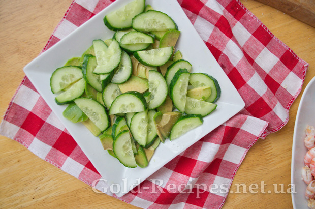 На плоску тарілку викладаємо порізані авокадо та огірки, і солимо за смаком.