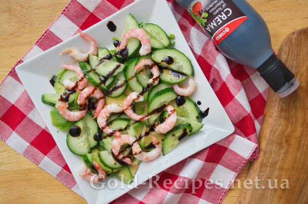 Наприкінці скроплюємо наш салат невеликою кількістю оливкової олії, і поливаємо крем соусом на основі бальзамічного оцту.