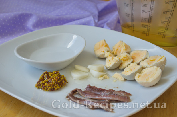 Підготуємо інгредієнти для соусу: відокремлюємо білки від жовтків, видавлюємо лимонний сік, чистимо часник, відміряємо потрібну кількість рослинної олії, гірчиці та філе анчоусів.