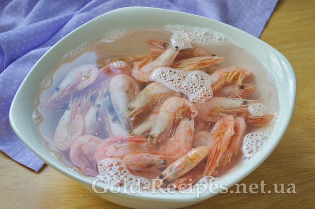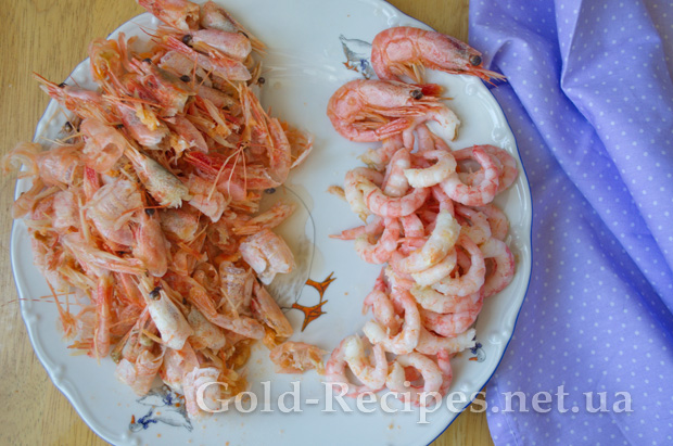 Далі чистимо креветки від панцира. Можна залишити кілька штук креветок у панцирі для прикраси і красивої ресторанної подачі салату.