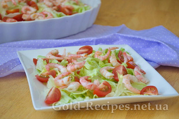 У плоский салатник, або порційну тарілку рвемо листя салату айсберг, розкладаємо зверху на салат порізані помідори і креветки.