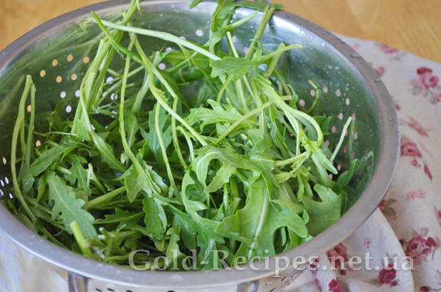 З підготовленої руколи обриваємо всі тверді гілки (якщо такі є), залишаємо тільки листя. Велике листя руколи потрібно розірвати навпіл. Розкладаємо руколу на порційні тарілки для салату.