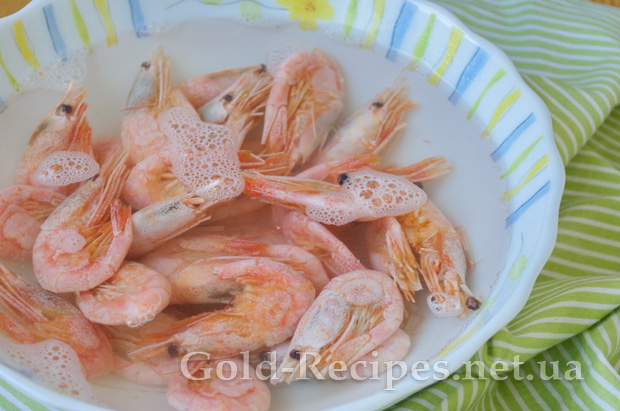 Насамперед займемося креветками: заливаємо креветки окропом і відставляємо в сторону до повного охолодження.