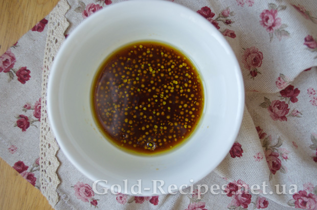 І на завершення поливаємо наш салат заправкою із соєвого соусу та гірчиці.