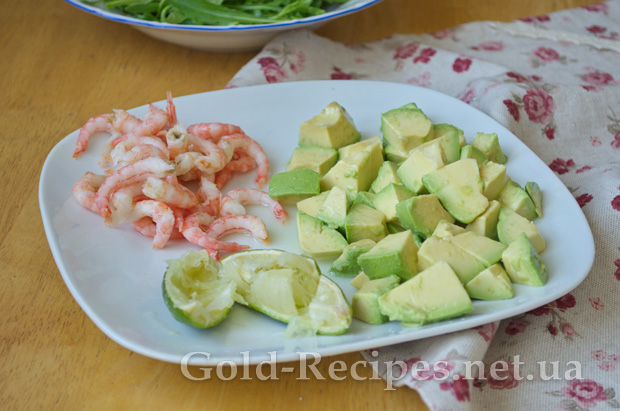 Зверху на листя руколи викладаємо креветки та авокадо.