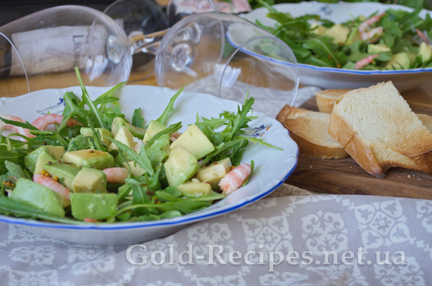 Вітаю вас, дорогі мої господиньки! Сьогодні я пропоную вам спробувати приготувати смачний і простий салат з креветками і авокадо в компанії соковитої і пікантної руколи.