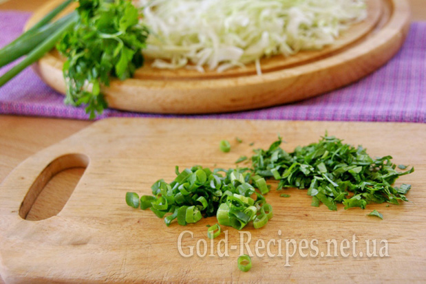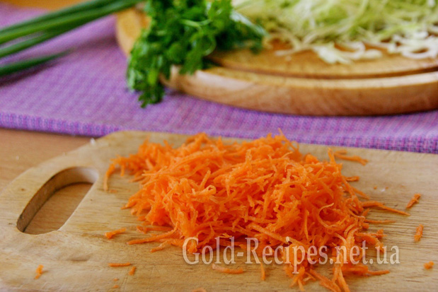 Капусту трохи присолюємо і перетираємо руками, щоб вона стала м’якшою, трохи пустила сік. Якщо капуста зовсім молода, перетирати її потрібно тільки злегка, вона дуже ніжна і швидко пустить сік.