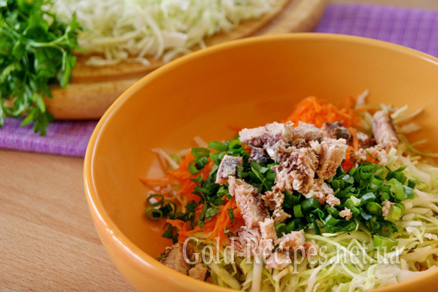 Консерви розкриваємо і виймаємо шматочки риби на обробну дощечку. Акуратно нарізаємо рибу невеликими шматочками. У мисці з’єднуємо капусту, зелену цибулю, моркву і рибні шматочки.