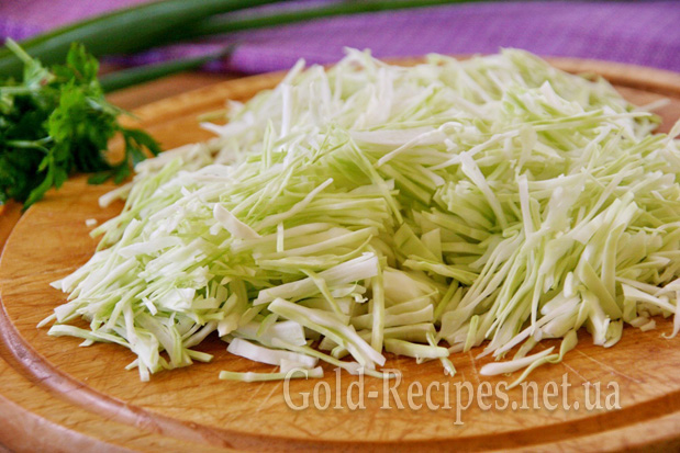 Капусту тонко шаткуємо невеликими шматочками завдовжки приблизно 3 см.