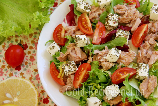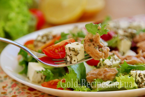 У цього смачного салату з тунцем основна родзинка саме в тому, що фета обвалюється в сушеному базиліку. Не ігноруйте цей пункт приготування, коли будете робити салат. Багато часу у вас це не займе, а ось страва вийде такою, якою має бути.