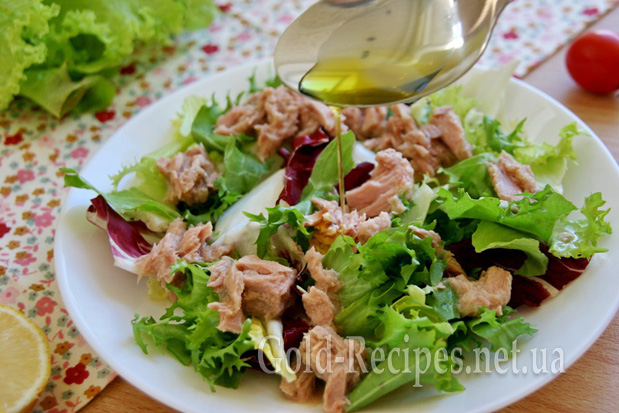 А потім поливаємо тунець і салатне листя оливковою олією.