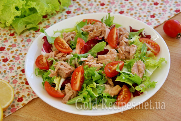 А рибку одним шматком слід розділити на частини (це легко зробити за допомогою виделки). Цього разу я використовувала консервований тунець у власному соку цілком. Викладаємо шматочки тунця на тарілку з салатним листям у довільному порядку. Збризкуємо рибу лимонним соком.
