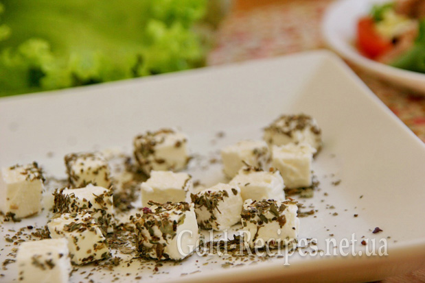 На плоску тарілку висипаємо сушений базилік. Фету ріжемо невеликими кубиками зі стороною 1-1,5 см. І обвалюємо кубики фети в сушеному базиліку.