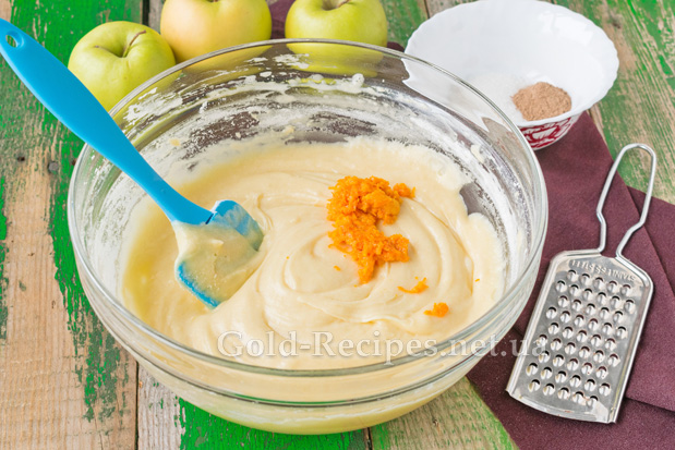 За допомогою дрібної терки знімемо цедру з одного апельсина. Додамо її в тісто.