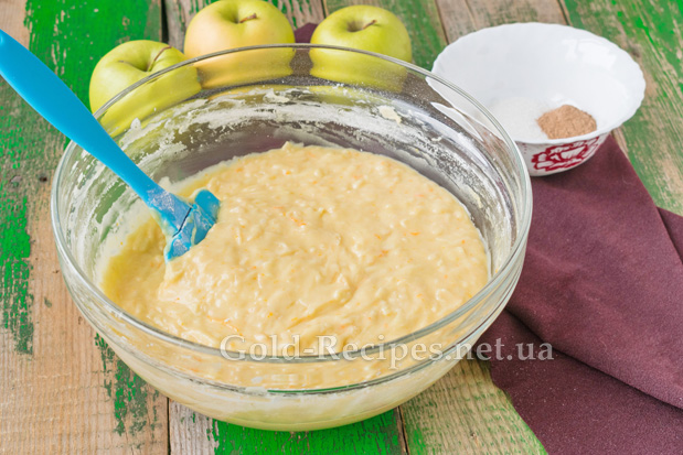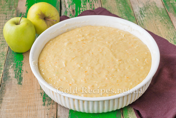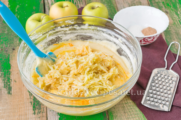 Два яблука помиємо, очистимо від шкірки та насіння і подрібнимо на крупній тертці. Додамо їх у тісто.